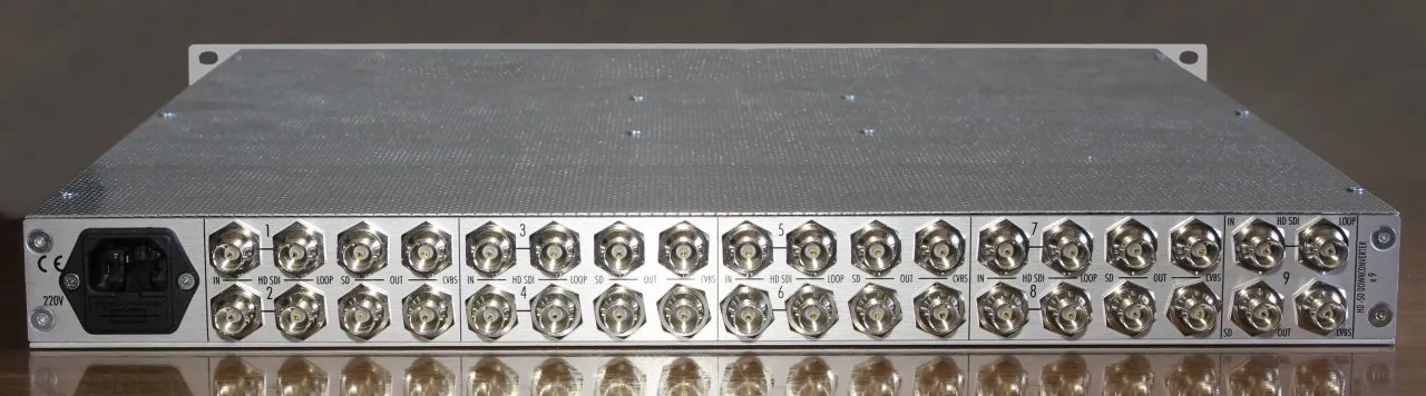 UPDOWN converter x 9 is composed of 9 converters that convert video signals in UP: SD SDI >HD SDI and in DOWN: HD SDI > SD SDI + CVBS composite (Pal/Ntsc). The input signal to a loop reclocked. The container is 1 rack unit, 420 mm deep and weighs 7.6kg.