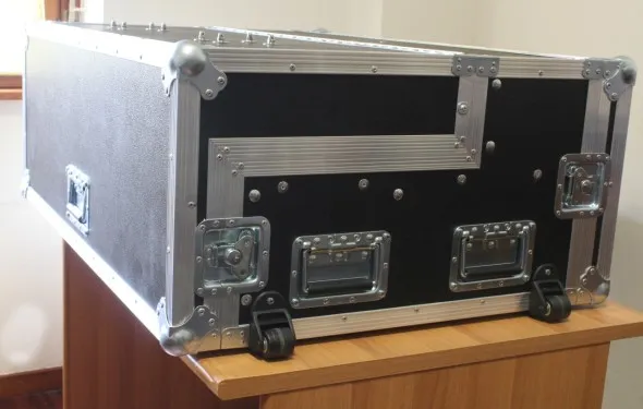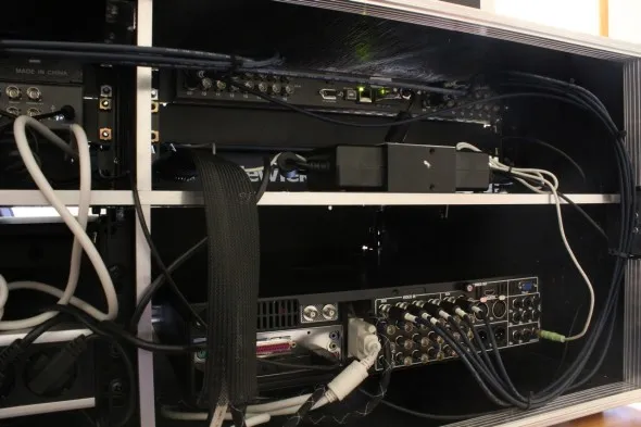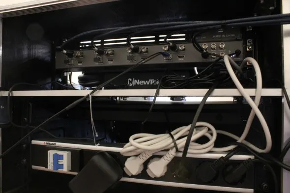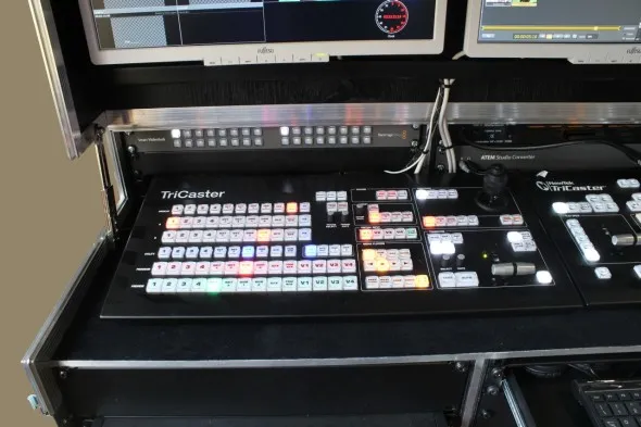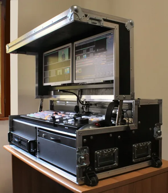 Rispetto alle precedenti regie la larghezza del contenitore è doppia sia perchè è montato un numero superiore di apparati sia perchè la superficie di controllo Tricaster - Control Surface 450 CS è più ingombrante rispetto alle precedenti e accanto alla 455 CS, essendo necessario anche l'uso della moviola, è stato montato il Tricaster Slow Motion Control 850 TW.