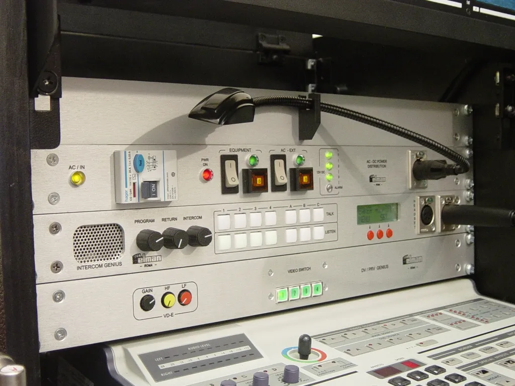 Intercom Genius Questo apparato (al centro) ha 3 funzioni distinte: interfonico, amplificatore di ascolto e tally. L' interfonico è un full/duplex e semi/duplex a 7 canali con modulazione di ritorno ed ingresso per external producer. L'interfonico ha tre canali a 2 fili (per le camere) e 4 canali a 4 fili per parlare ad esempio con un producer esterno ,salette di registrazione, pullman esterno, etc...