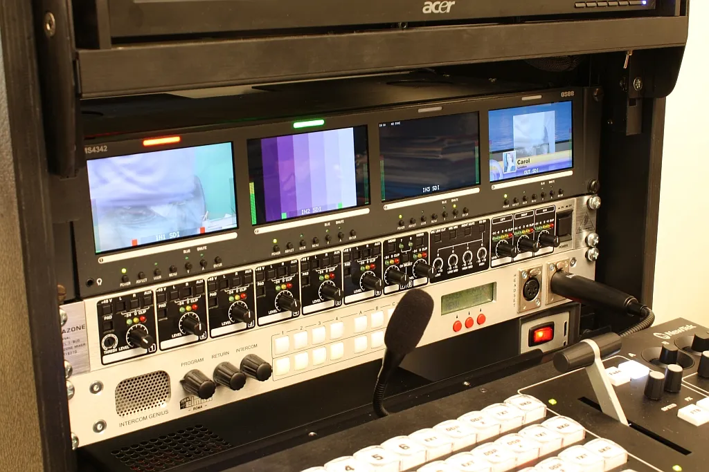 Questo apparato (al centro della regia) ha 3 funzioni distinte: interfonico, amplificatore di ascolto e tally.